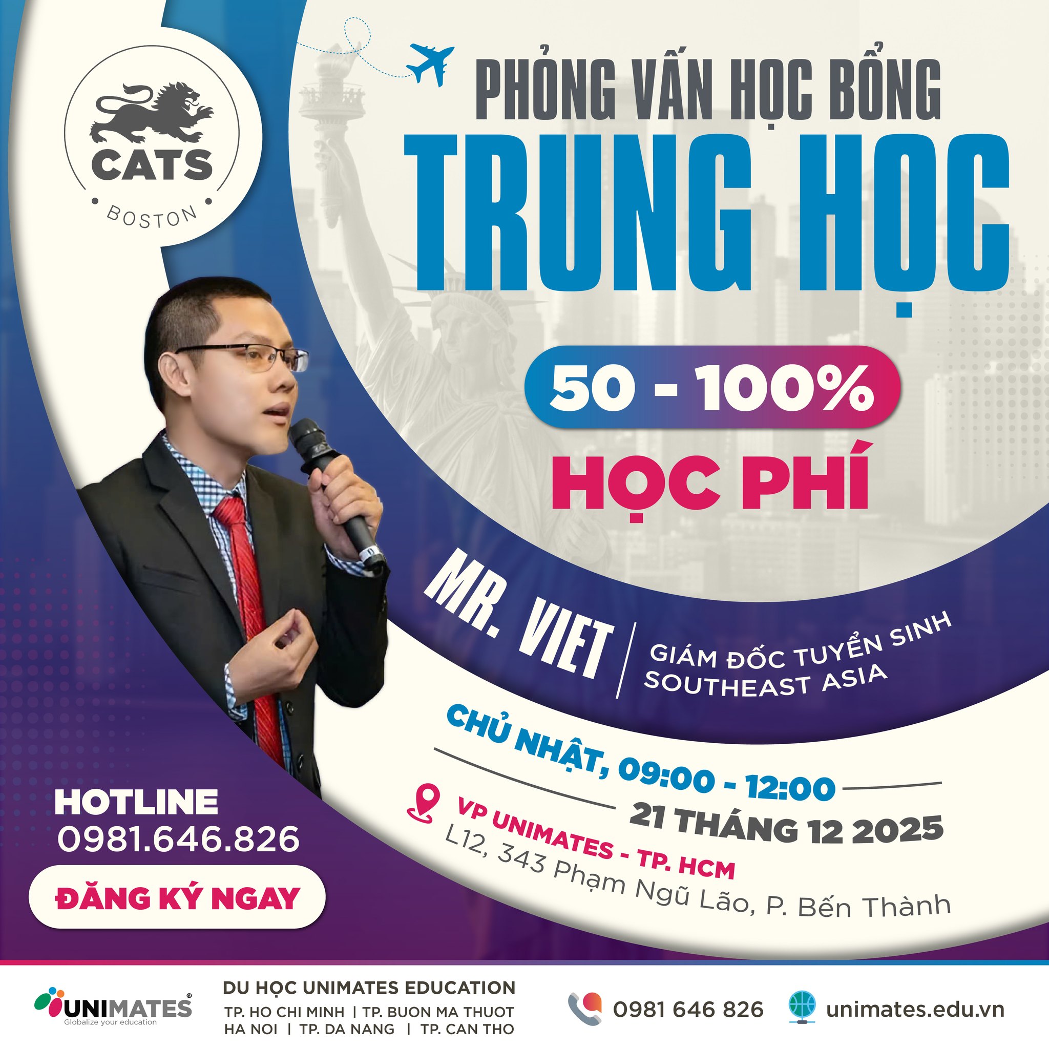 Hot Nhất Tháng 12 Phỏng Vấn Học Bổng Trung Học Mỹ 50% – 100% | CATS Academy Boston | Xem chi tiết |