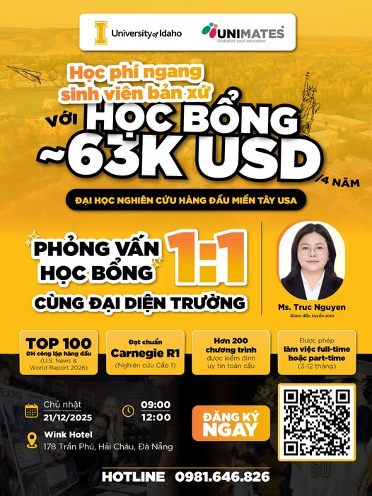 Phỏng Vấn Nhận Học Bổng Gần $63K/4 năm từ Đại Học Nghiên Cứu Hàng Đầu Miền Tây | University of Idaho | Xem chi tiết |